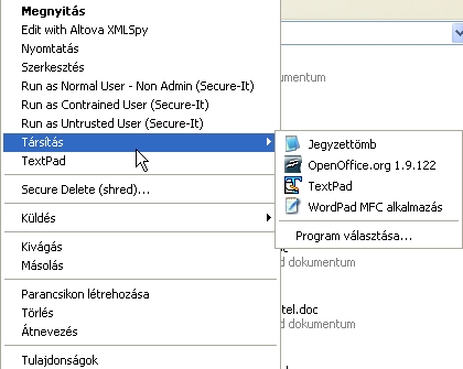 [%TAB%]A magyarázat röviden a következő. Amikor programot telepítünk, az magához próbálja ragadni saját adatfájljainak kezelését. Ezt a Registry azon bejegyzésein keresztül teszik, amelyek az adott fájltípushoz tartozó kiterjesztésekhez társítandó programokat és végrehajtandó parancssorokat tartalmazzák. Minél több programot telepítünk, annál több bejegyzés kerül ide s jelenik meg opcióként a jobbklikkes menüben.