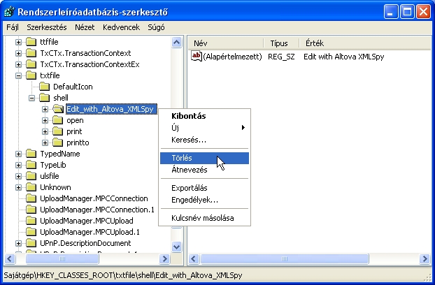 [%TAB%]A Regedit indítása után (Start / Futtatás… / Regedit) keressük meg, majd töröljük a jobbklikkes menüből eltávolítani kívánt szövegsort az alábbi vagy hasonló Registry kulcsok egyike alatt: