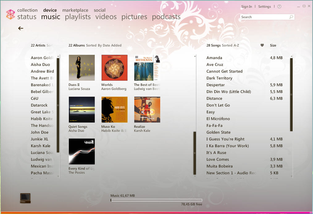 A kizárólag internetről letölthető szinkronizáló alkalmazás kellemes kezelő felületet nyújt. Egyszerüsége kiforratlanságában és az iTunes-hoz képest jóval kevesebb funkció nyújtásának is köszönhető. Így a