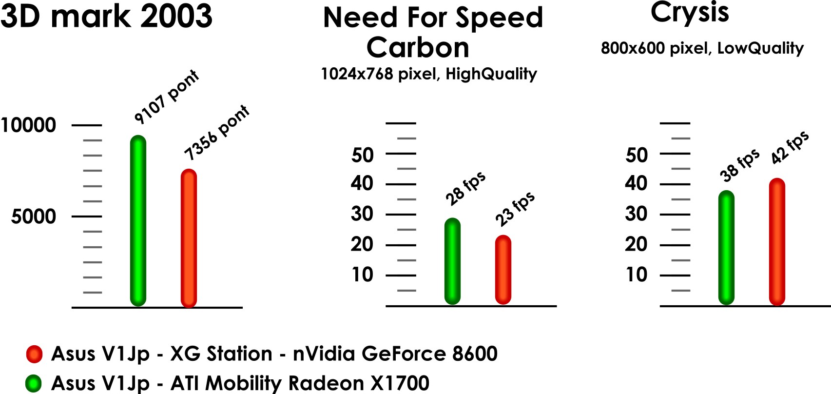 Azt mindenképp le kell szögezni, hogy az integrált videó kártyák semmiképp sem vehetik fel a versenyt az XG Station-el azonban egy GeForce 8600-as nem nyújt drasztikusan nagyobb sebességet az komolyabb multimédiás noteszgépekben található dedikált rendszerekhez képest, sőt, egy újabb ATI vagy nVidia modell simán lekörözi. A másfél éves teszt laptopunk ATI X1700-as 512 MB memóriával rendelkező videó kártyája ugyan a 3D Mark 2003 –ban némileg alulmaradt, de a különbség egyáltalán nem egetverő. Sőt a meglehetősen erőforrás igényes Crysis esetében az XG Station már egy kevéssel alulmaradt az ATI X1700 -hoz képest.