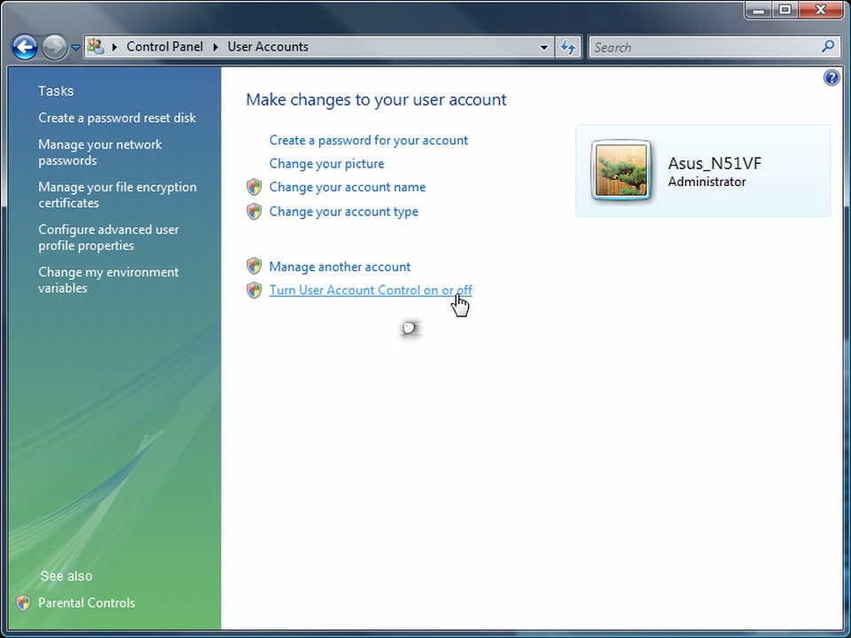Térjünk vissza a kikapcsolási folyamathoz, melyhez kattintsunk a Startmenüre, majd nyissuk meg a vezérlőpultot. A vezérlőpultban keressük meg a felhasználói fiókok (User Accounts) beállítást és kattintsunk rá kettőt. Ezt követően megnyíló ablakban lesz egy olyan sor melyben a „Turn User Assount Control on or off” mondat lesz olvasható, vagyis a Felhasználói fiók felügyelet vezérlés ki vagy bekapcsolása. A következő ablakban már végre a tényleges kikapcsoláshoz jutottunk. Ezt követően természetesen újra kell indítsuk a gépet, de legközelebb már nem lesz gondunk az idegesítő ablakokkal.