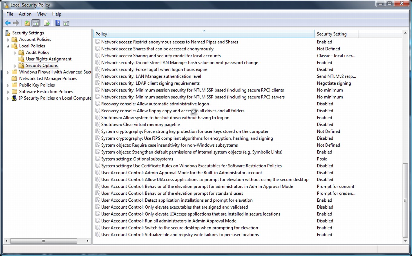 A startmenüben írjuk be a keresőbe a secpol.msc kifejezést majd kis iőd múlva megnyílik a Vista belső helyi biztonsági házirend szabályokat beállító programja. Ezen belül a bal oldali fa szerkezetben nyissuk meg a Local Policies (Helyi Házirend)/Security Options (Biztonsági beállítások) fület, ahol némi görgetés után megtaláljuk a User Account Control-hoz tartozó beállításokat.