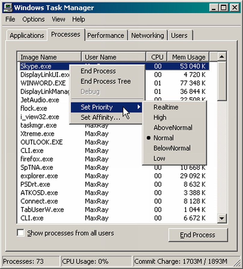 mindig normál szinten indítja a programokat és folyamatokat. A lehetséges prioritási szintek a következők a legkisebbtől a legnagyobbig haladva: Low, Below Normal, Normal, Above Normal, High, Realtime. Mivel egy mag egyszerre csak egy dolgot csinálhat a prioritási szintek határozzák meg, hogy mely program kapja a következő CPU számítási időt, és mennyi ideig birtokolhatja azt. Ha egy alkalmazás a normál szint felett fut akkor több CPU időt kap, mint a Normál szinten vagy az alatta futó programok. Az XP-ben és a Vista-ban egyébként 32 lehetséges prioritási érték van az operációs rendszerben meghatározva, de a legmagasabb 31-es körüli értékek az OS