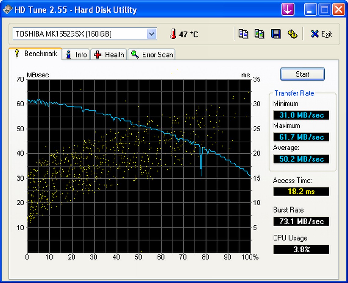[%IMAGE=9519%]A háttértároló az új D150 sorozatban továbbra is hagyományos merevlemez, mely tesztmodellünknél egy Toshiba (MK1652GSX) gyártmányú 2.5 colos 160 GB kapacitású