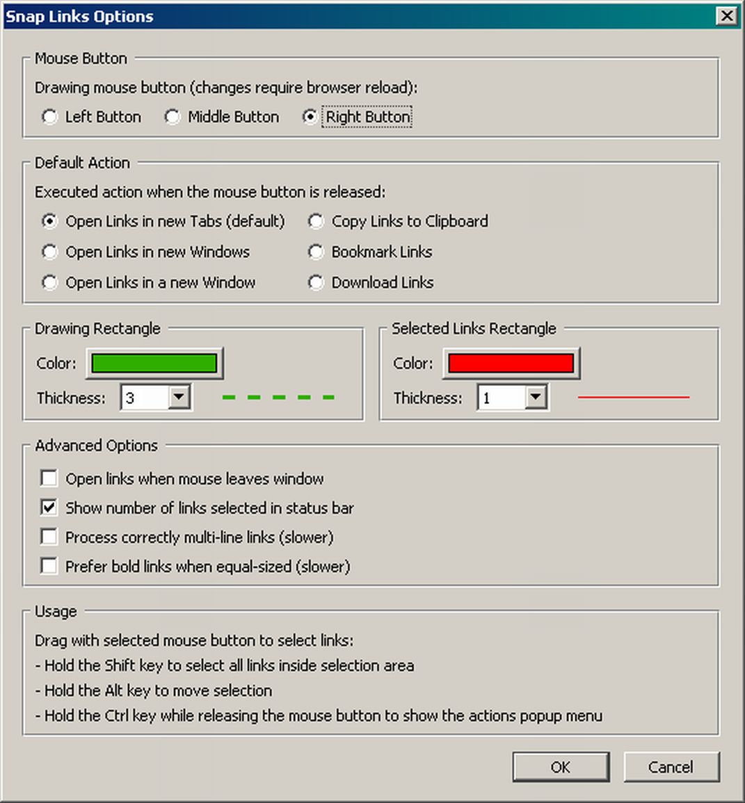 A beállítások menüpontban természetesen beállíthatjuk, hogy a kijelöléskor ne megnyíljanak a linkek, hanem mondjuk kerüljenek a kedvencek közé, esetleg a linkeket a vágólapra is másolhatjuk egyszerre, és természetesen a funkció indításához is hozzárendelhetjük bármelyik egérgombunkat.