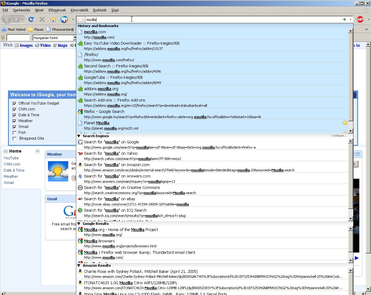 A keresőmező rendszerint külön helyet foglal el a címsor mellett, azonban lehetőségünk van az egyesítésre hála a kiegészítőknek. Mi most két hasonló bővítményt kombinálunk, melyek a CyberSearch 1.0.7 és a Searchery 0.3.1. Ezek együttese nemcsak áthelyezi a keresősávot a címsávba hanem ahogy elkezdünk beírni egy kulcsszót, vagy címet legördülő lista fog megjelenni az előzményekben illetve a kedvencek közt tárolt oldalak közti találati listából, alatta a keresőmotorok linkjei találhatóak, legalul pedig a Google és az Amazon első néhány találata látható, melyekre kattintva azonnal meg is nyílik a szóban forgó oldal.