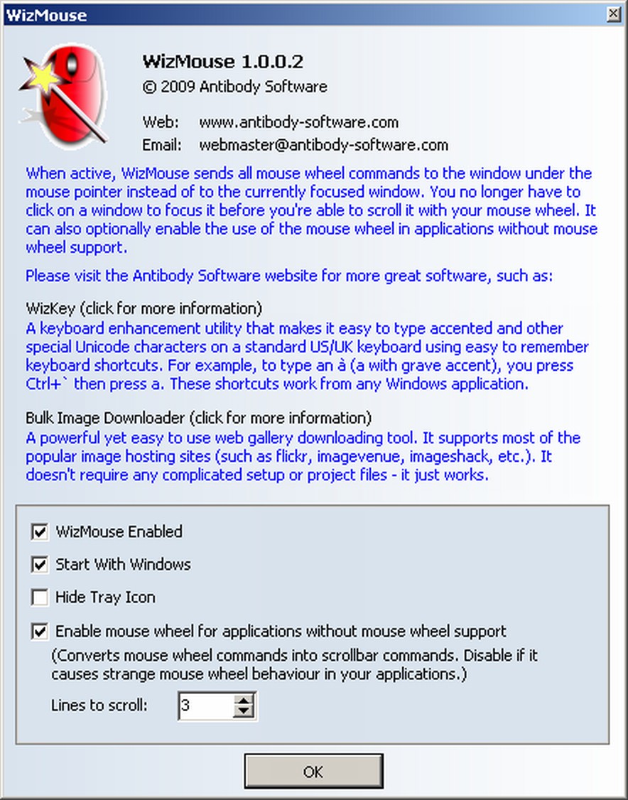 Ez a sok kattintás időveszteséggel és kellemetlenséggel is jár, ám szerencsére van megoldás egy apró alkalmazás a WizMouse formájában, mely két fontos újítást tesz hozzá egerünk müködéséhez. Először is ott fogunk görgetni amelyik ablak fölött éppen állunk anélkül hogy oda kellene kattintanunk, a másik pedig hogy a görgetést alapértelmezésben nem támogató programokban is lehetővé teszi a görgő használatát. Telepítést követően a jobb alsó sarokban vagyis a SystemTray-ben lévő ikonra kattintva konfigurálhatjuk kis segédeszközünket, ami teljesen ingyenes.