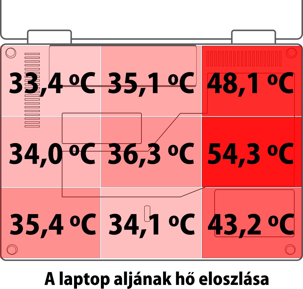 A hőtermeléssel már egészen más a helyzet. A gép nagyon erős négymagos processzort és tekintélyes teljesítményü