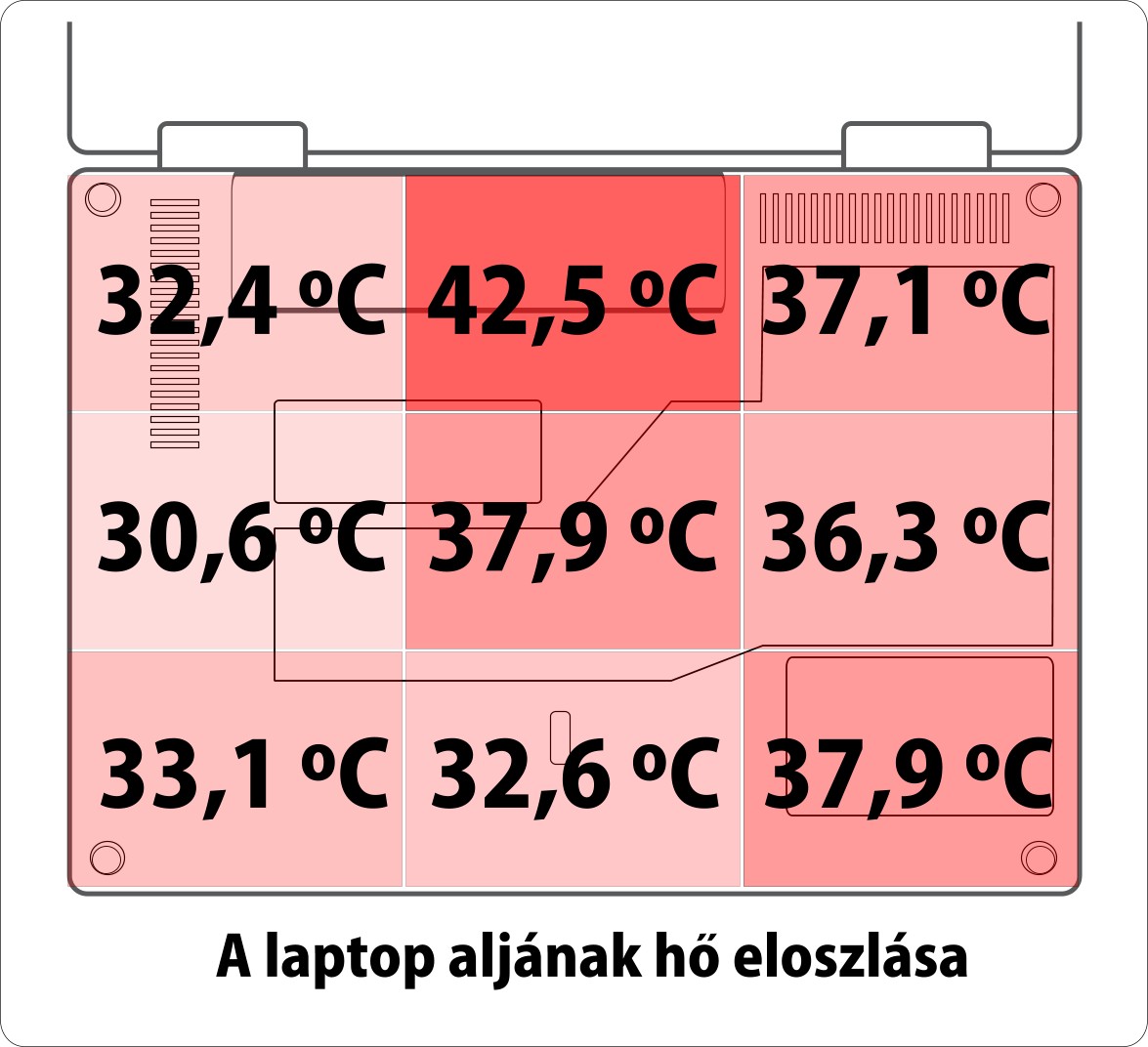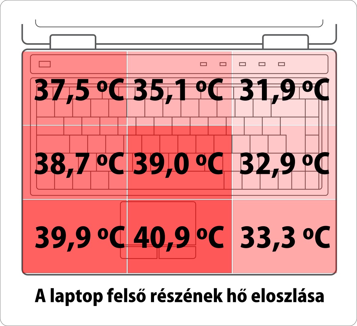 miatt aggódnunk. A hő eloszlás nem túl szerencsés, mivel az előre helyezett akkumulátor és a gép belső felépítése miatt a billentyüzet bal oldala kissé felmelegszik, mely a bal oldali csuklótámasz és főképpen az érintőpad területén tovább fokozódik. Tesztmodellünkben egy meglehetősen kis kapacitású akkumulátor volt, mely teljes terhelés, 80 százalék körüli fényerő mellett alig több mint egy óra húsz perc üzemidőt biztosít, de még takarékoskodva sem sajtolhatunk ki bekapcsolt