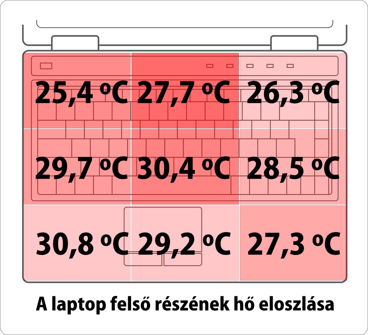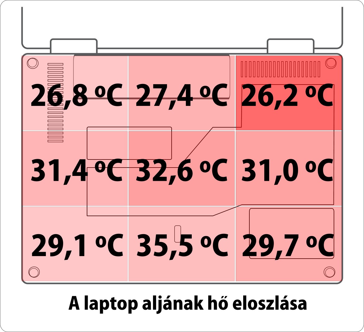 A CULV rendszer ugyan nagyon szerény teljesítményü ám ezzel párhuzamosan nagyon kevés hőt is termel és a laptop legmelegebb pontja is alig érte el a 35 fokot, míg a klaviatúra 30 fok körül maradt ami szintén nagyon jó. Mindehhez pedig nem kellett fejfájdító ventilátor zúgást sem hallgatnunk háttérzörej gyanánt. A hütőrendszer hangja csak erősebb terhelésnél hallható ám akkor sem zavaró.