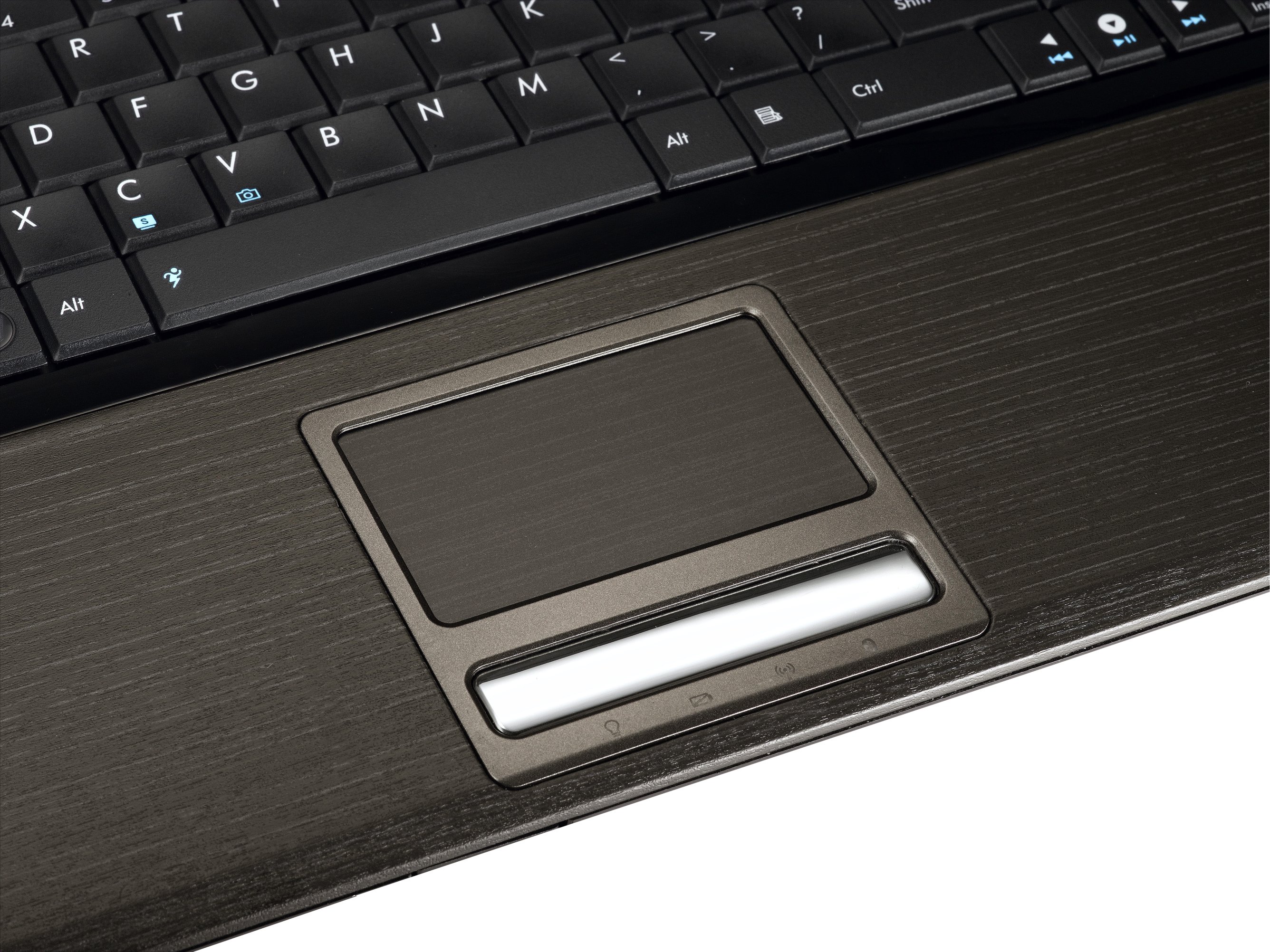 billentyüzet közvetlen szegélye is. A csuklótámasz illetve az alulsó borítás széle pedig a már sokat taglalt famintázatú borítást kapta. Tesztmodellünk billentyüzete angol kiosztású volt, ám feltehetően a magyar változatnál sem lesz gond a hosszú „í”-vel mivel a bal oldali Shift meglehetősen (talán túlzottan is) széles. Az N60D billentyüzete teljes numerikus résszel is rendelkezik, ám itt a billentyük kissé keskenyebbek, mint a többi részen ahogy a kurzor mozgató billentyük is. Fura és zavaró kombináció, hogy az InsertAz Asus gépeknél szokásosnak is mondható gyorsgombok is megtalálhatóak a billentyüzet feletti dísz sávban. A bekapcsoló gombon kívül itt található az érintő felület kikapcsoló gombja, böngésző indító, teljesítmény szabályzó és az Express Gate indító gomb is. A merevlemez