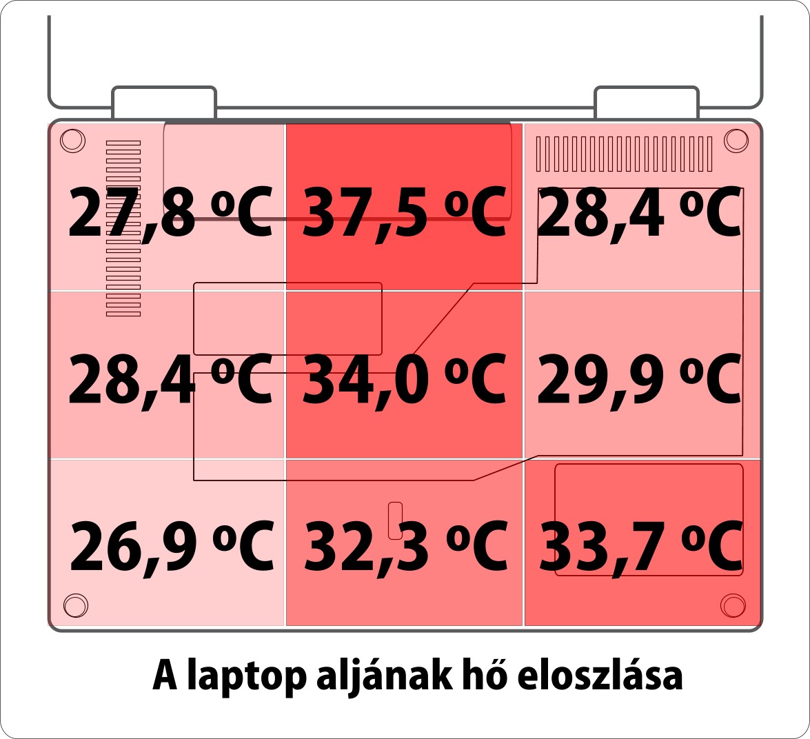 A laptop hütőrendszere egyénként remekül teszi a dolgát és drasztikus melegpontokat sehol sem mértünk, valamint az érintőpad és klaviatúra is kifejezetten kellemes hőmérsékletü tud maradni.