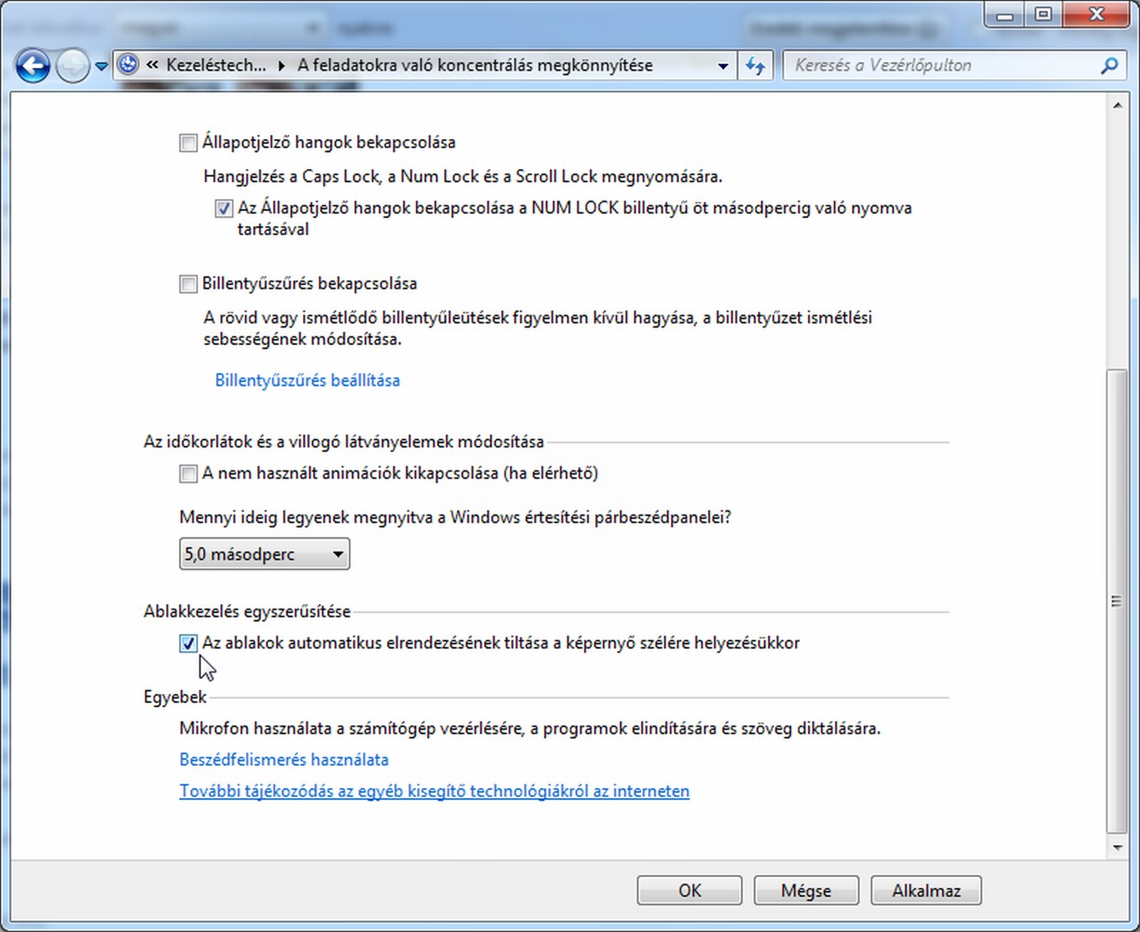 3. [%TAB%]Itt keressük meg a „Az ablakok automatikus elrendezésének tiltása…” (Prevent windows from being automatically arranged when moved to the edge of the screen) és jelöljük be a szöveg előtti jelölőnégyzetet, majd zárjunk minden ablakot az Alkalmaz illetve OK gombokra kattintva.