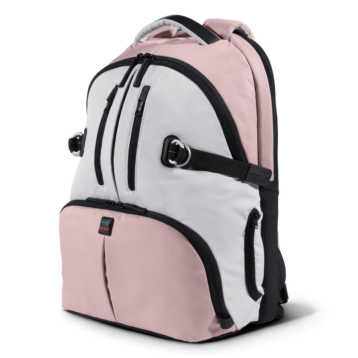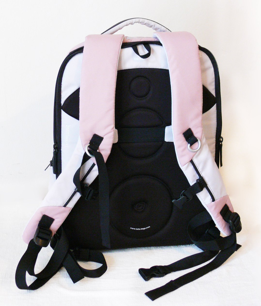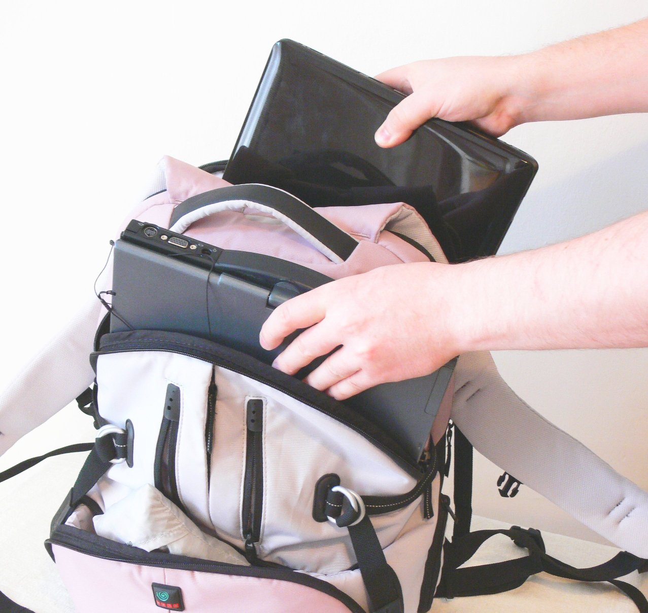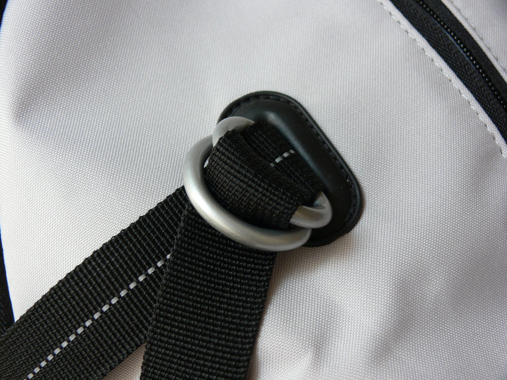 A táska párnázott, gerinc kímélő hátfallal rendelkezik és a pántok szélesek, vastagon párnázottak, így még rendesen megpakolva is kényelmes viseletet biztosít. Elöl, a mell részen a pántokat össze is kapcsolhatjuk, illetve a derekunknál is rögzíthetjük a táskát egy extra pánttal. A táska önmagában nem vízálló ezért kapunk hozzá egy esővédő köpenyt. Ez a plusz „bőr” egy apró önmagába csomagolható, tenyérnyi csomagként a táskánkban elfér, így egy hirtelen zápor esetén sem kell félnünk, hogy a drága eszközeink eláznak, mert esetleg otthonfelejtettük a táska „esőkabátját”. Sajnos a vállpánt kialakítása miatt az esőkabát a laptop rekesz felső részét nem takarja teljesen, ha a hátunkra vesszük a tatyót, így nagyobb zivatarban inkább húzódjunk esővédett helyre.