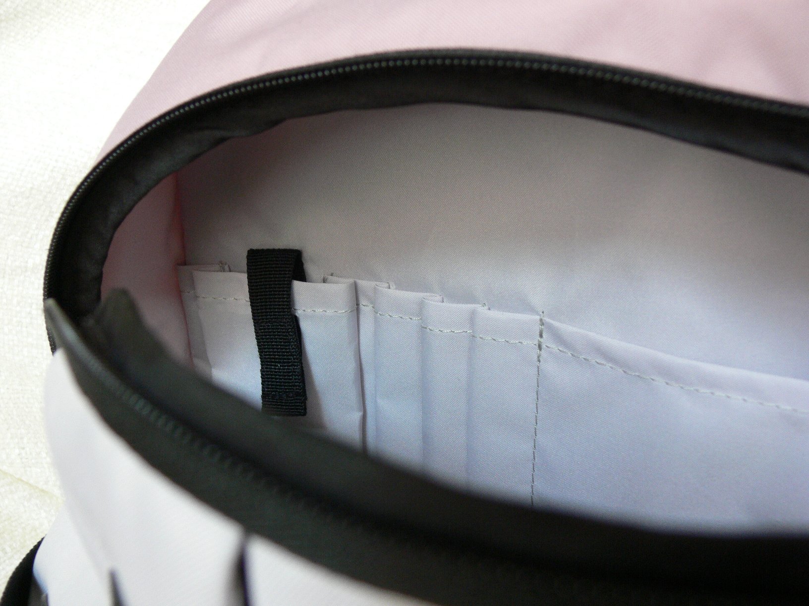 A táskának ezt a részét, mintha kifejezetten nőknek tervezték volna. A nagyobb egybefüggő részben elfér minden női dolog, sőt könyv, neszesszer táska, jegyzettömb, határidőnapló a teleofnunknak külön tartó is van ahogy a tollaknak és egyéb apróságoknak is. A rekesz külső falán három kisebb cipzáras zseb található, melyek közvetlenül, kívülről érhetők el. Ezekbe beletehetjük a mindennapokban elengedhetetlen apróságainkat, mint például tükröt, rúzs, púder, esetleg kulcscsomó, zsebkendő, (kisebb plüss állatka). A felső rész tetején a gumírozott fül mögött egy kijáratot találunk, melyen keresztül a táskába rejtett zenelejátszónk vezetékét bújtathatjuk ki.
