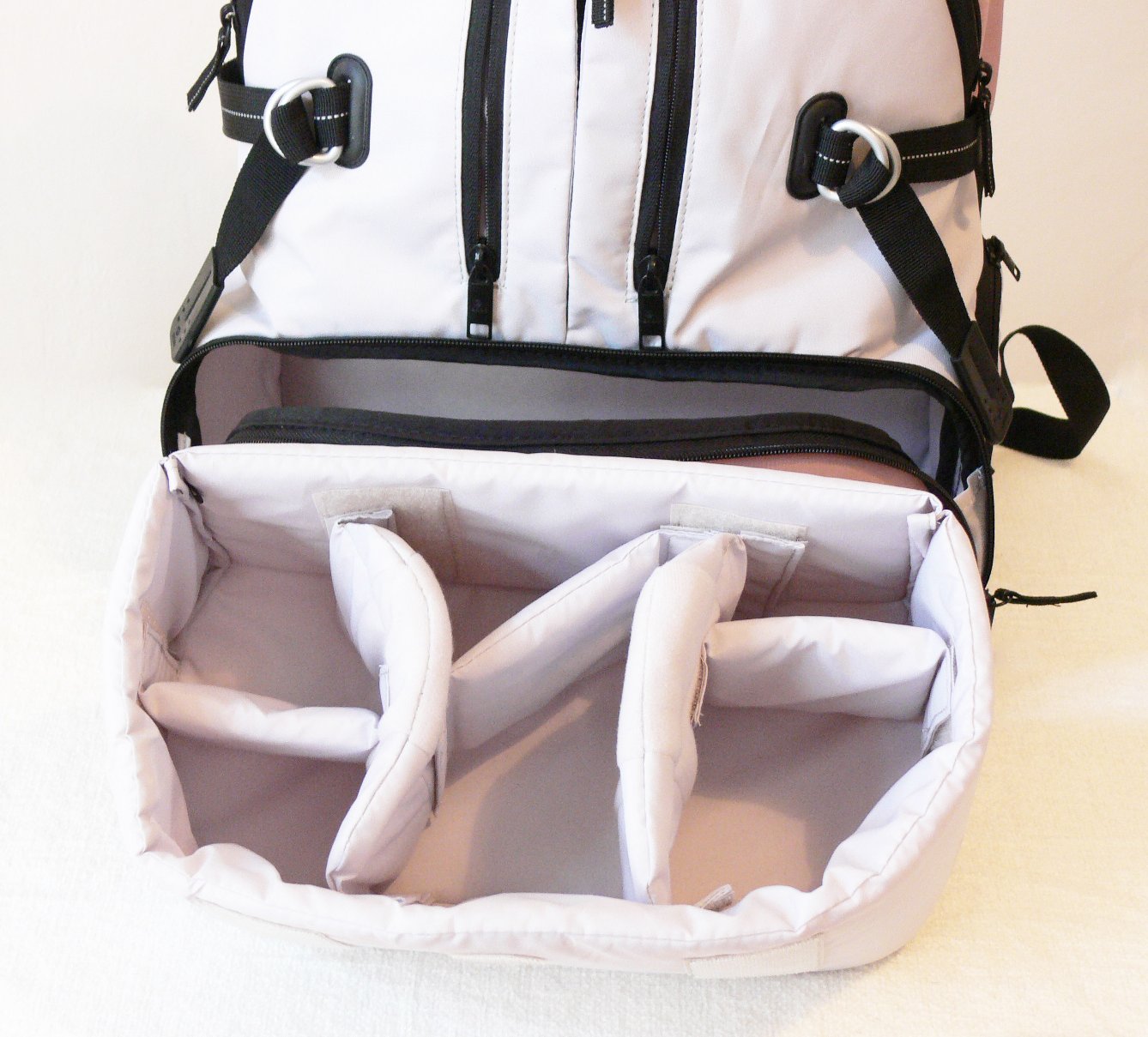 fényképezőgép 3-4 objektív és még pár apróság is könnyedén elfér. Az alapértelmezésben hat részre osztott „fiók” elválasztó falait tetszőlegesen variálhatjuk, így minden típushoz és felhasználói szokáshoz igazítható a rekeszek mérete és elrendezése. Ezen felül az utólag megvásárolható Modi-Vers tároló rendszerrel is kompatibilis ez az alulsó rész. Ahogy arra már utaltam az egész fotós tároló részt egyben kivehetjük, ha éppen nincs rá szükségünk és ekkor egy általánosan használható nagyméretû zsebet kapunk, mellyel a táska átlényegül laptop hátizsákká.