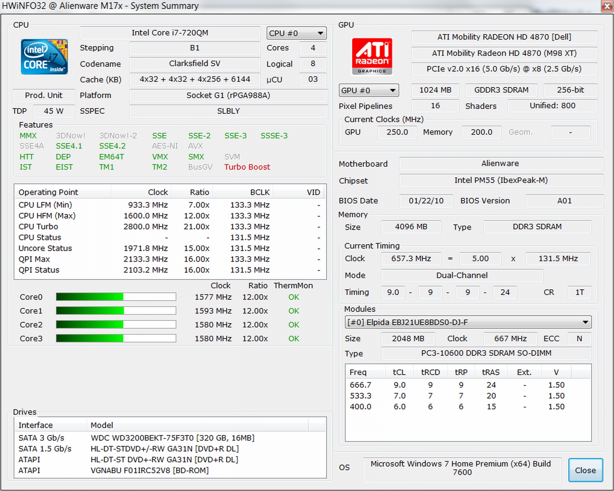 Core i7 720QM modell, mely 1.6 GHz-es alap órajelen ketyeg és 6 MB