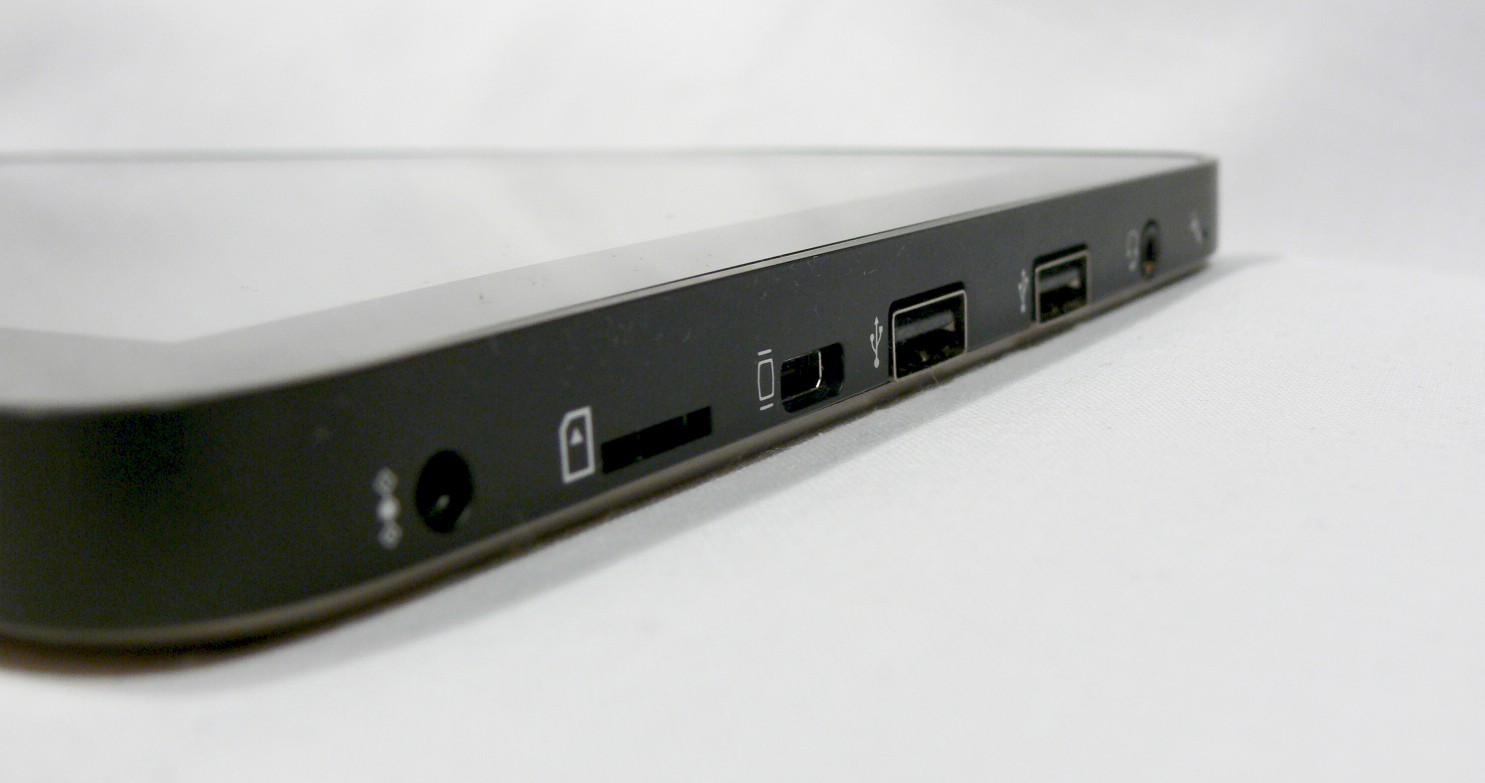 eszköz csatlakoztatunk egyszerre, már bal oldalt nem olyan kényelmes tartani a tabletet. Ami talán még fontosabb a mikrofon a gép bal alsó sarkára, az oldalborításra került. Ez nem szerencsés, mivel könnyel lefoghatjuk vagy letakarhatjuk az amúgy sem jó helyen lévő mikrofont. A gépen a két USB 2.0 csatoló mellett mini VGA