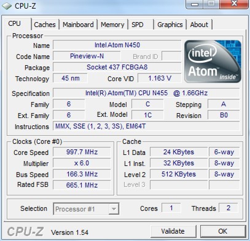foglalt helyet (a gyári specifikációkban N450 szerepel), mely 1.66 GHz-es órajelen m?ködik és ugyan egyetlen processzor