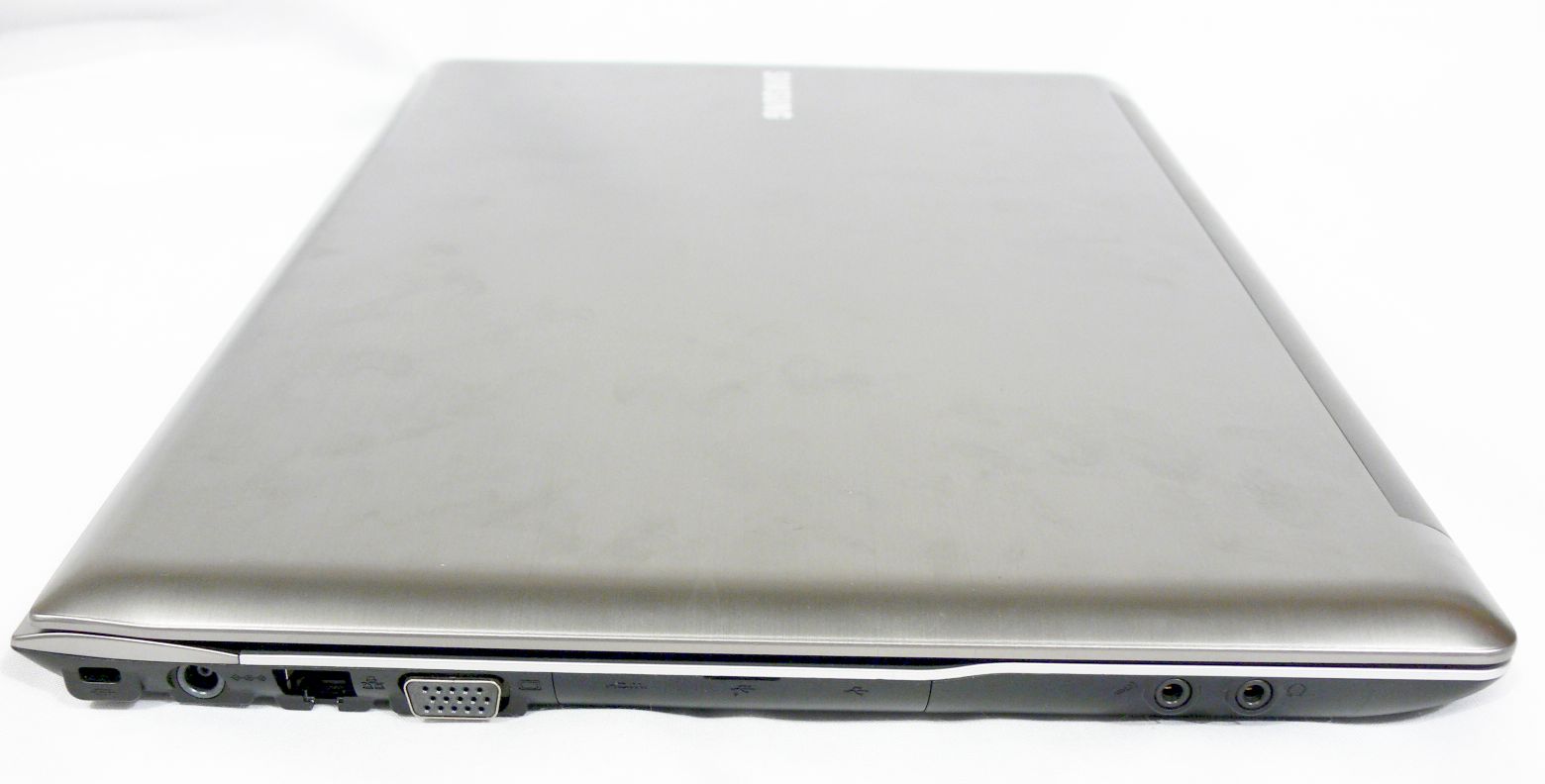 QX510 (NP-QX510H) modell járt.Az elegáns megjelenés? notebook borítását alumínium és m?anyag elemekből készítették. A szálcsiszolt alumínium fedél egyetlen „díszítő” eleme a Samsung logó, mely kissé szokatlan módon lett elhelyezve. Az enyhén elhajló ívekben végződő fedelet felnyitva egy meglehetősen minimalista belső fogad minket, mely bizonyos vonásaiban az Apple gépekre emlékeztet minket. Ilyen az egybefüggő plexi bevonatot kapott képernyőborítás, mely szemben a keményebb üveg és más anyagokkal, kevésbé ellenálló viszont lényegesen könnyebb. Az alap alá bukó fedél formája és kialakítása szintén nagyon hasonló az Apple MacBook Pro modelleknél látottakra. Az almás gépeknek más funkciója is visszaköszön a Samsung megoldásán.