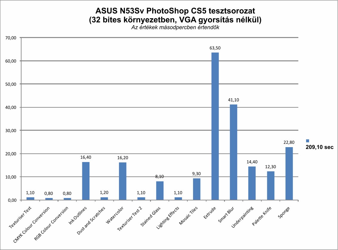 mag teljesítménye is javult, ám a dedikált VGA megoldásokkal továbbra sem veszi fel a versenyt. A CPU azonban számos új képessége és nagyobb teljesítményre révén jeleskedik video kódolásban és elődeinél egyaránt jobban teljesít egy magos és több magos alkalmazások esetén. Egyes statikus számítási teszteknél 40-50 százalékos javulást is mértünk, ám általános elmondható, hogy átlagosan 20-30 százalékkal jobb az új generációs Core széria az előzőnél.[%IMAGB=15852%]Tesztmodellünkben az NVIDIA GeForce GT 540M megoldása foglalt helyet, mely 1024 saját memóriával rendelkezett. Ez a GPU a laptop 1366x768 képpontos képernyőjéhez megfelelő párosítás, hiszen ekkora felbontáson a legtöbb játékot is magas grafikai beállításokkal képes futtatni a gép. Ezen felül az N53Sv ideális grafikai például PhotoShop munkákra is ahol a VGA kártya segítsége nélkül a laptop az asztali (gyári órajelen m?ködő) Intel Q9550 processzorral szerelt asztali gépek teljesítményével egyenérték? eredményeket produkált (a tesztek 32 bites környezetben zajlottak).