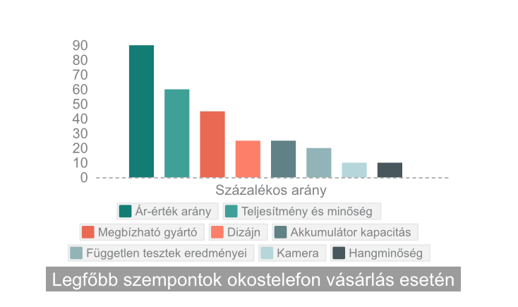 A megkérdezettek válaszai között, a fent említetteken kívül számos más szempont is szerepelt, mint a kijelző mérete, a kamera képességei vagy akár a független fórumokon olvasott kritikák és ajánlások, mégis az első helyen, döntő többséggel az ár-érték arány végzett, hiszen a több mint 1300 válaszadó 90 százaléka ezt a szempontot tartja leginkább döntőnek új okostelefon vásárlásakor. A második helyen álló teljesítményen belül a válaszadók említették többek között a készülék operációs rendszerét és hardverét, valamint a hosszú élettartamot. A megbízható, neves gyártó fontossága a harmadik helyre került, mivel a felhasználók mérvadónak tartják a választott gyártó más termékeivel kapcsolatos pozitív, személyes tapasztalatokat és kritikákat. Külső szempontjából a válaszadók kiemelték a szép, egyszerű, minimalista formákat és a kényelmes, kezelhető méretet, míg a hosszú üzemidő ugyancsak kényelmi és funkcionális szempontból került be a legfontosabb szempontok közé.