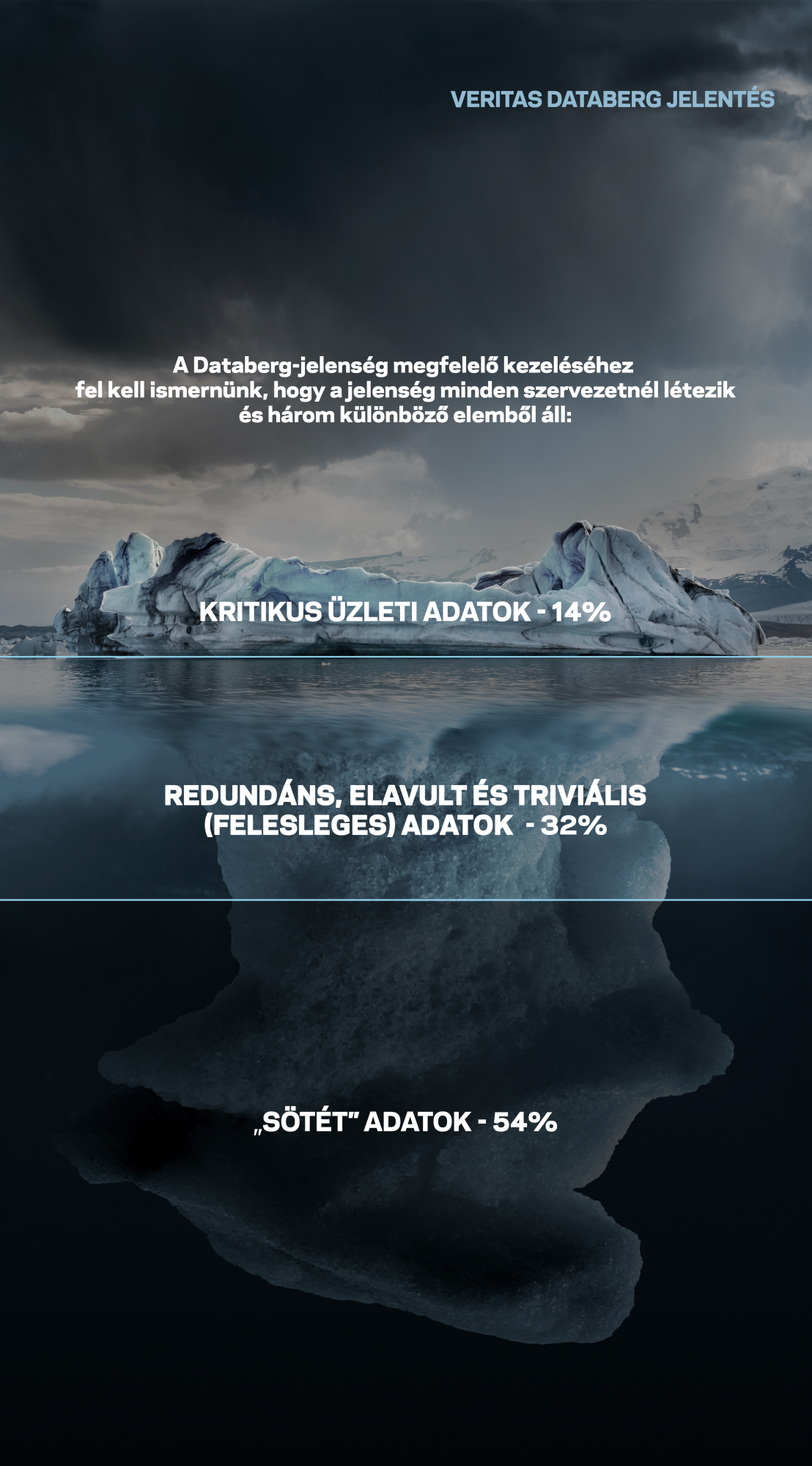 A kutatás keretében a Veritas közel 1500 embert kérdezett meg az EMEA régió 14 országában arról, hogy milyen kihívásokkal szembesülnek a vállalati adatok értékes üzleti információvá alakítása során. A riport egy új jelenséget is bemutat, amelynek a jéghegyekhez hasonló tulajdonságai miatt a Databerg nevet adták a Veritas szakemberei. Eszerint a tárolt adatok három fő típusát különböztetik meg a szakemberek: