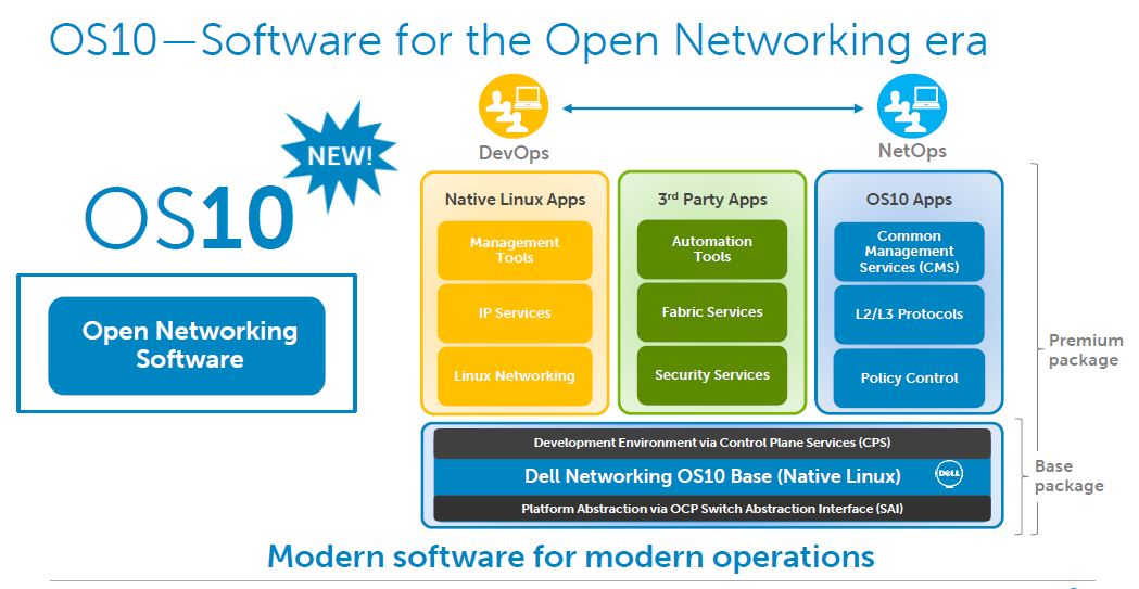OS10 alapmodul – Az OS10 alapmodul ingyenesen hozzáférhető és teljesen nyílt, módosítás nélküli Linuxdisztribúciót futtat. A Linux az egyik legelterjedtebb operációs rendszer, és közös platformot biztosít többek között a hálózatkezelés, a tárolók és a szerverek területén. Az OS10 alapmodul a Linux közösségi megoldásainak előnyeit aknázza ki a felette lévő alkalmazási réteg programozhatóságát, hordozhatóságát és rugalmasságát javítva.