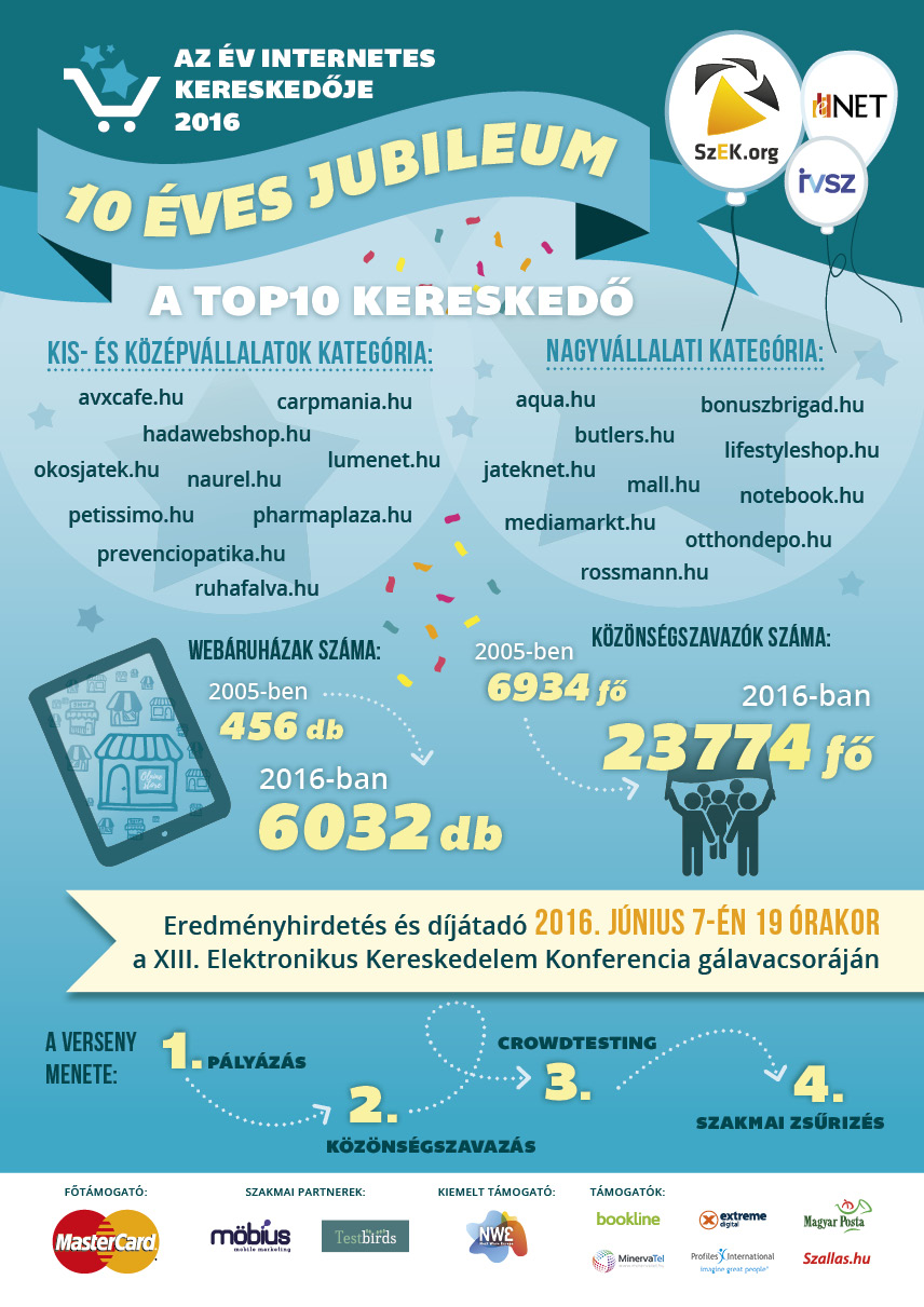 A különböző iparágakból érkezett webshopok elemzésénél a Testbirds által használt módszertan négyféle mutatószám eredményét kombinálta, minden webshopot 20-20 tesztelő véleményezett, így összesen 400 kérdőív eredménye alapján alakult ki a kis és közepes és nagyválallati kategóriában a legjobb 10 webáruház. Ebből a listából neves szakmai grémiumból álló zsűri fogja titkos szavazással kiválasztani kategóriánként azt a kereskedőt, akit a legjobbnak tart. A Díj nyertese az lesz, aki a beküldött pályázati anyag és zsűri szavazata alapján a legtöbb pontot gyűjti.
