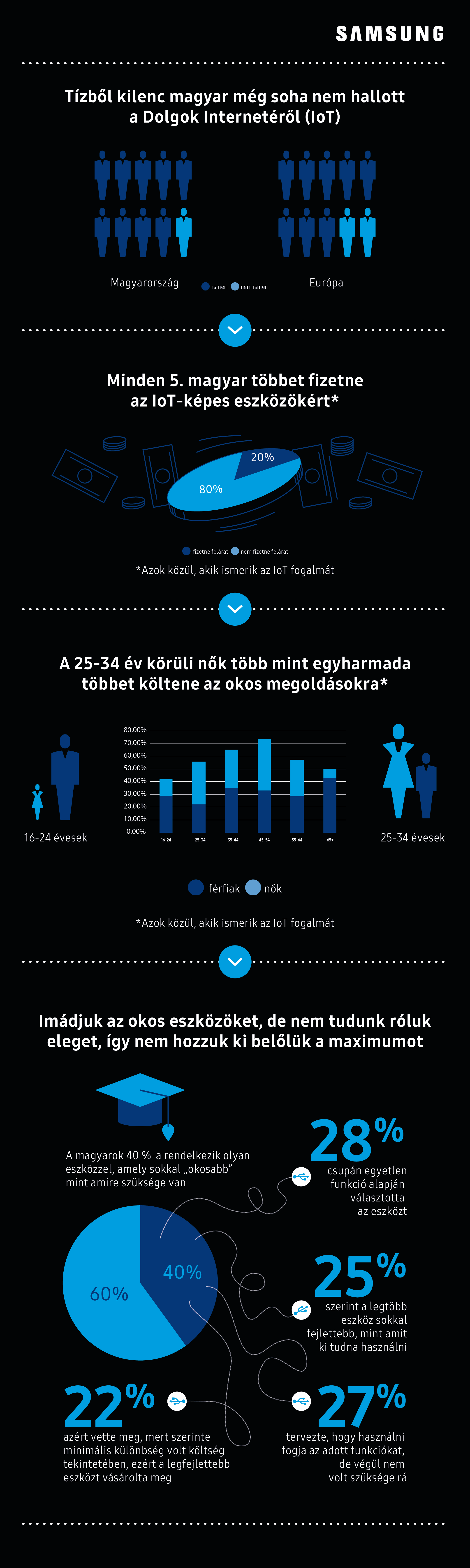 Bár az IoT-t még nem ismerik a magyarok, kiemelkedően fogékonyak a technológiai újítások iránt: 58 százalékuk figyelemmel kíséri a legújabb fejlesztéseket, és tízből kilenc válaszadó a közeljövőben vásárolni tervezett elektronikai eszközök tulajdonságaira is ügyel. Ennek ellenére a magyarok mintegy 40 százalékának van legalább egy olyan okos készüléke, amelyet nem tud teljes mértékben kihasználni. Közülük minden harmadik vásárló mindössze egyetlen funkció alapján választotta ki az adott terméket. Hiába képes tehát az eszközünk csatlakozni az internethez, ha nem ismerjük az IoT-ban rejlő lehetőségeket, nem is tudjuk kiaknázni azokat.
