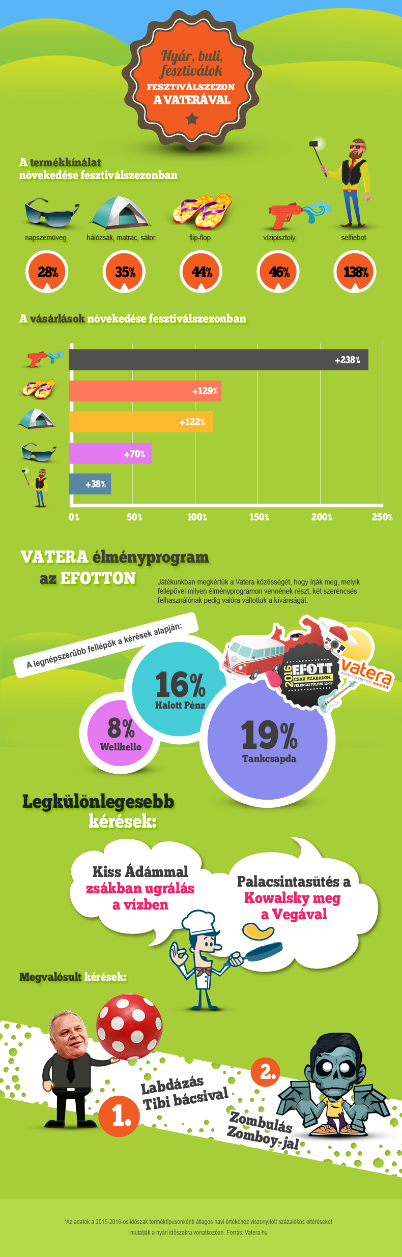 A Vatera az egyik legismertebb hazai fesztivál, az idén július 12. és 17. között Velencén megrendezett EFOTT támogatójaként nyereményjátékot hirdetett, hogy néhány fesztiválozó testközelből is találkozhasson kedvencével. A játék résztvevőinek nem kellett mást tenniük, mint elmondani, hogy milyen élményprogramon vennének részt kedvenc fellépőjükkel. A legnépszerűbb, legtöbbek által kért előadók a Tankcsapda és a Halott Pénz voltak, de akadt olyan is, aki Kiss Ádámot hívta volna ki egy zsákbanugrálás-versenyre a vízben, vagy a Kowalsky meg a Vega tagjaival sütött volna palacsintát. A két nyertes a két főre szóló hetijegy mellett végül egy hazai ikonnal, valamint egy külföldi hírességgel oszthatott meg életre szóló élményt. Egyikőjük az egykori Három kívánság műsorvezetőjével, Tibi bácsival, a másik szerencsés pedig a Zomboyként ismert brit elektronikus DJ-vel, Joshua Mellodyval találkozott.
