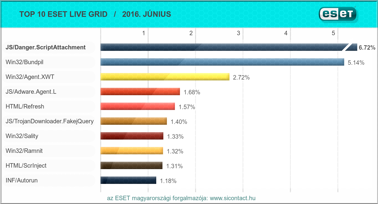 Júniusban megőrizte vezető helyét a JS/Danger.ScriptAttachment trójai. Ez egy olyan kártékony, JavaScript fájl, amely fertőzött e-mailek mellékletében terjed, és a futása során képes a megtámadott számítógépre további kártékony kódokat letölteni. Ezek között lehetnek zsaroló programok is, amelyek fájlokat titkosítanak, rombolnak, majd váltságdíjat követelnek a felhasználóktól.