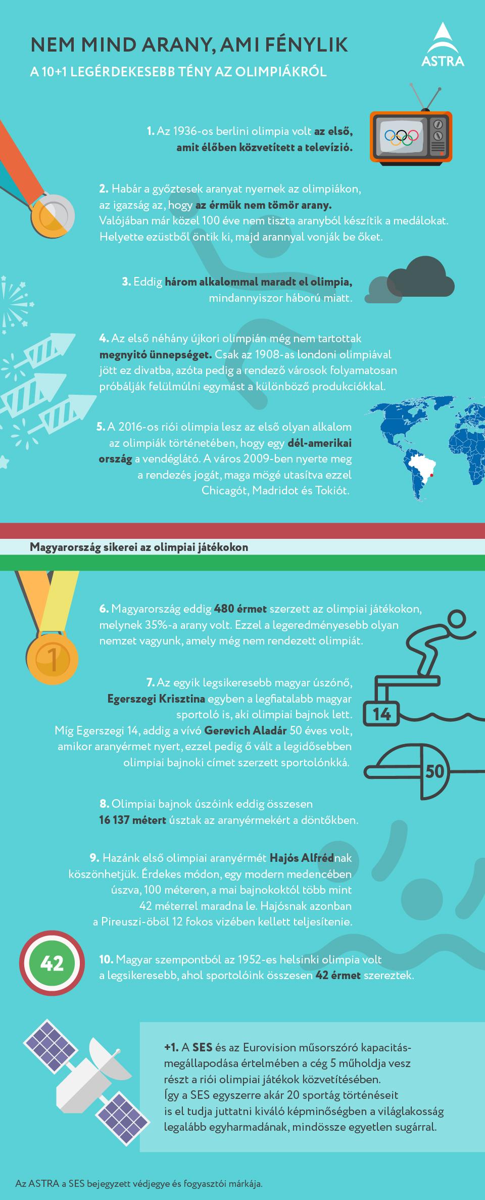 Alig ért véget a labdarúgó Európa-bajnokság, de a világ máris olimpiai lázban ég. A 2016-os sporteseményt Rio de Janeiróban rendezik meg, ami minden eddiginél emlékezetesebbnek ígérkezik. Az idei, 31. nyári olimpiai játékokra rekordszámú nevezés érkezett, összesen 206 ország delegálja sportolóit az eseményre. Az eddigi legtöbb, 306 aranyérmet osztanak majd ki 28 sportágban. Míg a helyszínen több mint 7,5 millióan, addig a műholdas közvetítéseknek köszönhetően több mint 4,5 milliárdan szurkolhatnak honfitársaiknak. Az olimpiákkal kapcsolatban azonban számos más érdekesség is van – ebből gyűjtötte össze most a SES, a világ vezető műholdas szolgáltatója a legérdekesebb tényeket.