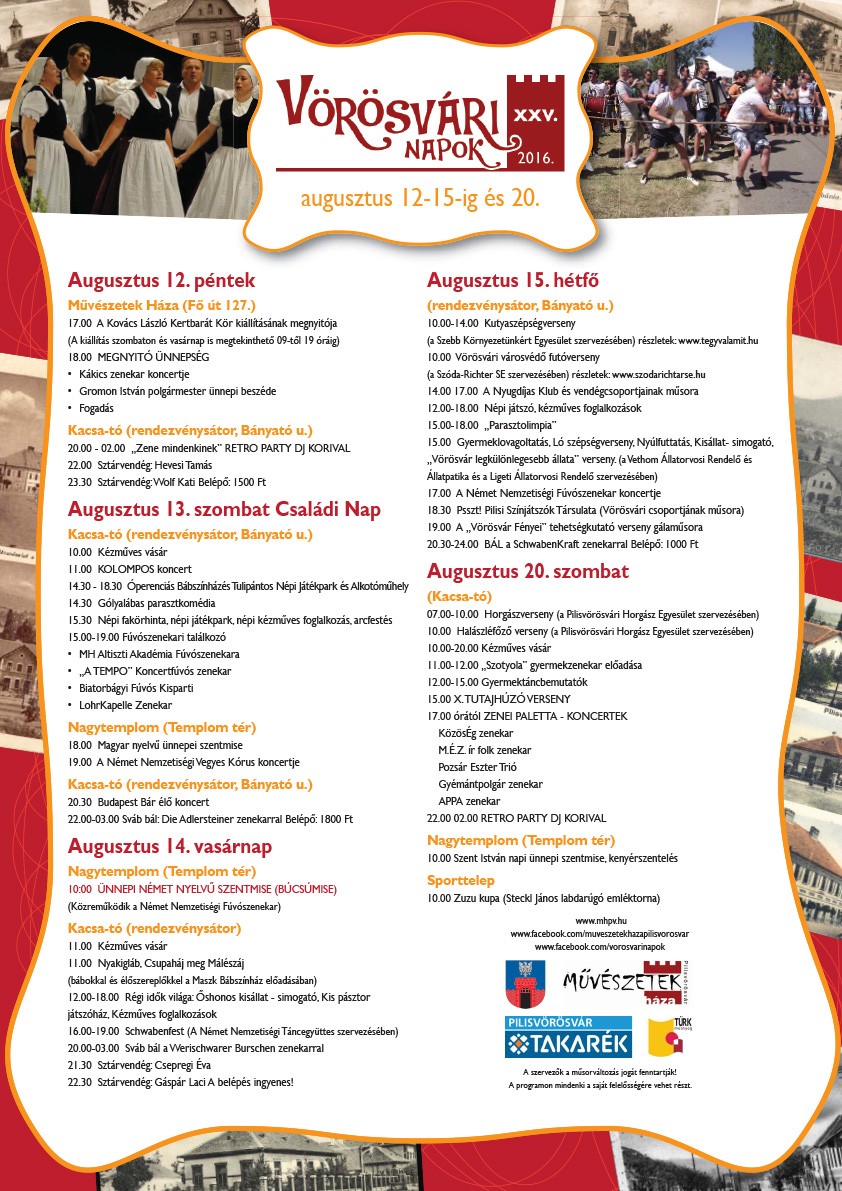 A térség legnagyobb hagyományőrző, kulturális, gasztronómiai rendezvényét, a Vörösvári Napokat rendezik meg az idei évben 25. alkalommal 2016. augusztus 12-15. között Pilisvörösváron.
