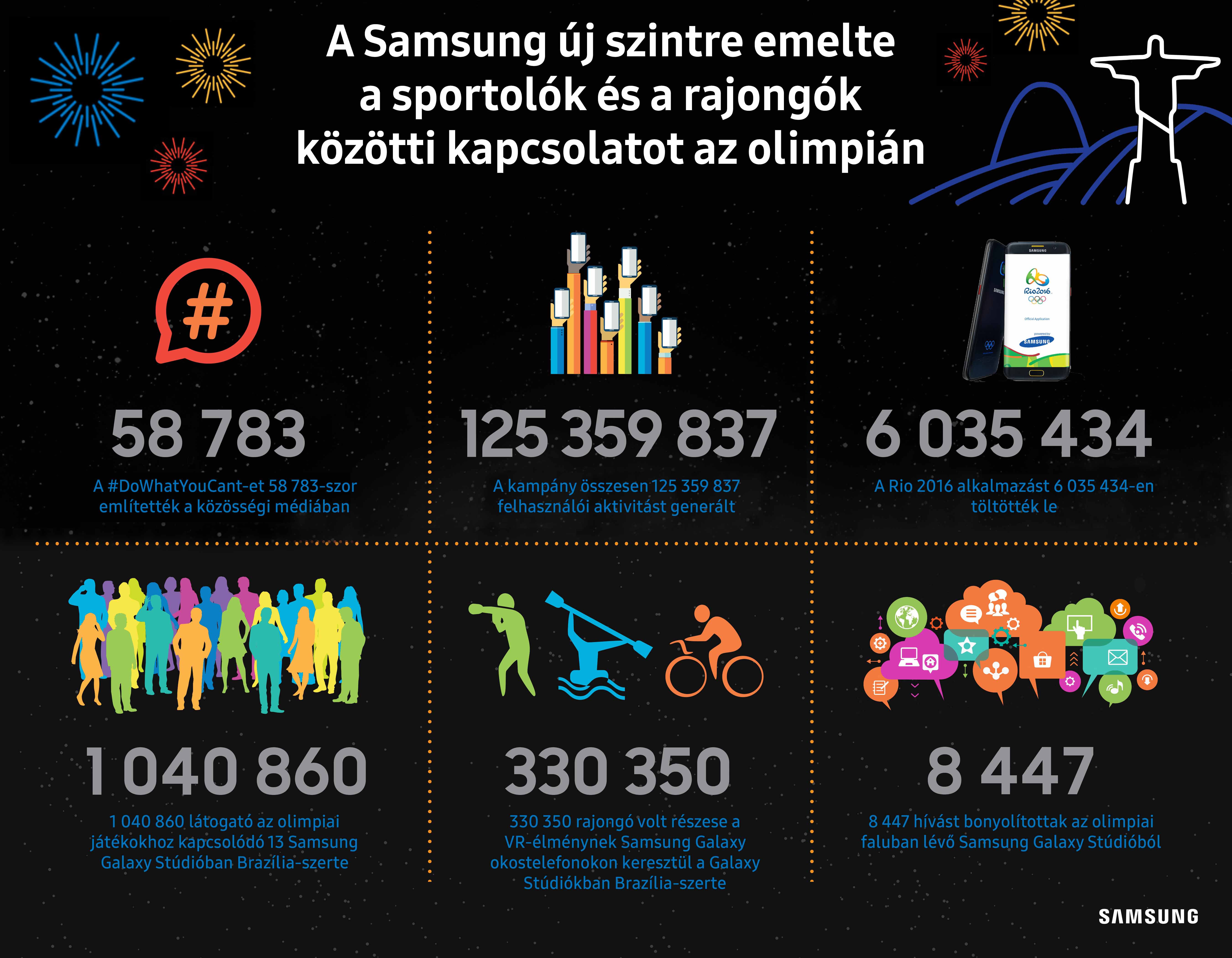 A Rio 2016 szervezőbizottságával együttműködésben a Samsung kifejlesztette a Rio 2016 hivatalos alkalmazását, amely éjjel-nappal ellátta a sportolókat, a rajongókat és a tartalomra éhes fogyasztókat a legfrissebb olimpiai hírekkel. Az olimpiai játékok összes digitális kommunikációjának bemutatása érdekében a múlt héten a Samsung megnyitotta központi Samsung Galaxy Stúdióját a Rio 2016 olimpiai játékok szívében, az Olimpiai Parkban, ahol a rajongók és a fogyasztók megismerkedhetnek a Samsung legújabb vezeték nélküli kommunikációs termékeivel és magával ragadó technológiáival.