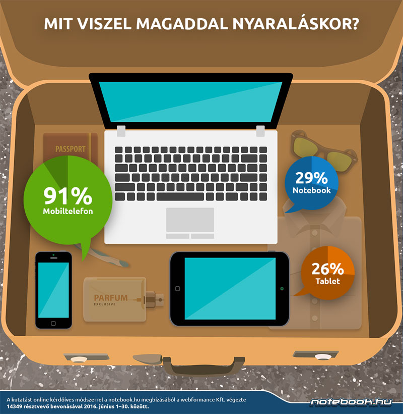 Ha valami nem hiányozhat a nyaralás alatt, az a telefon. Egyértelmű, hogy akinek van és elutazik, az magával viszi, a válaszadók csupán 29%-a pakolja be a nagyobb méretű notebookot és csupán 26%-a a tabletet. Ami viszont érdekesség, hogy a férfiak nagyobb arányban (33%) viszik magukkal - talán dolgozni - a laptopjukat, még a hölgyeknél ez az arány csak 23%, és inkább a kisebb méretű táblagépre voksolnak. De mi a helyzet az egyéb szokásokkal és tervekkel?