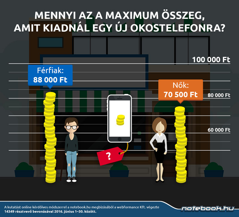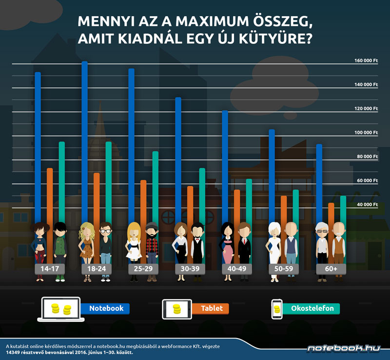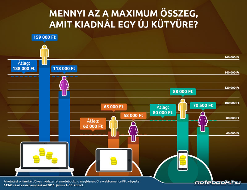 Míg előbbi okostelefonra közel 90 ezer forintot is hajlandó lenne költeni, úgy nők esetében ez az összeg maximum 70 ezer forint. Még szembetűnőbb a különbség a notebookoknál: a férfiak közel 160 ezer forintot is áldoznának egy új gépért, a nők maximum 118 ezerben gondolkodnak. Tablet esetében is a férfiak költenének többet, 65 ezer Ft körül, a hölgyek pedig csupán 58 ezer Ft-ot szánnának rá.