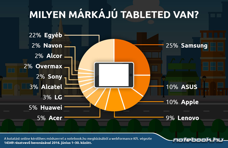 A tabletek versenyét ugyancsak a Samsung vezeti a kérdőíves listán (25%), a második helyen az Asus (10%) és az Apple (10%) termékei állnak. A dobogó harmadik helyére pedig a Lenovo állhat fel 9%-kal.