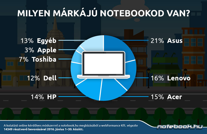 Notebookok esetében a legtöbb válaszadó az Asust jelölte meg (21%), második a Lenovo (16%), harmadik az Acer (15%) lett. Ezenkívül még érdemes megemlíteni, hogy a megkérdezettek 14%-ának HP, míg 12%-ának Dell notebookja van otthon. Apple MacBookot csak a válaszadók 3%-a tart otthonában.