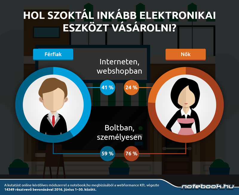 Meglepő, hogy az interneten, webshopban vásárolt elektronikai eszközök aránya a válaszadók körében alacsonyabb, mint várnánk, csupán 34%, míg 66% válaszolt úgy, hogy inkább üzletben, személyesen vásárol „kütyüket”. A férfiak egyébként jóval nyitottabbak az internetes vásárlásra: elektronikai eszközt 41%-uk vásárolt már webshopban, míg a nőknél ez az arány csak 24%.
