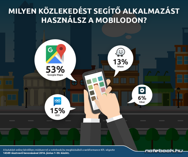 – amely az elmúlt időszakban önálló, multifunkciós platformmá alakult – 85%-kal magasan verte a hagyományos sms-t, de a Viber is jól szerepelt 38%-kal. A Skype és a WhatsApp már kevésbé erőteljes, előbbi 19%, utóbbi 7%-ot képvisel a felmérésben.Közlekedést segítő alkalmazások tekintetében a Google Maps elsöprő többséggel (53%) győzött, őt az Igo (15%), a Waze (13%) és az Uber (6%) - béke poraira - követi. Az 50 év felettiek több mint fele viszont nem használ semmilyen alkalmazást.