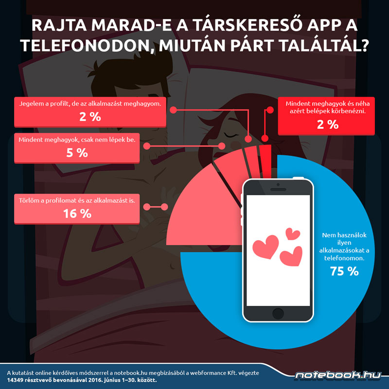Ami a társkeresést illeti, váratlan eredmény született: a válaszadók döntő többsége, 75%-a nem használ társkereső applikációkat (mint például a kifejezetten okostelefonokra fejlesztett Tindert, vagy a hagyományos, internetes társkeresők mobilbarát applikációit) a telefonján. Akik használnak, azok törlik is regisztrációjukat, miután párra találtak. Csupán elenyésző azok száma, kik jegelik (inaktívvá teszik) profiljukat (2%), vagy mindent meghagynak, de nem lépnek be (5%). A pártalálás után is társkereső applikációkat használók 2%-ot képviselnek a felmérésben – és a férfiak vannak többségben.