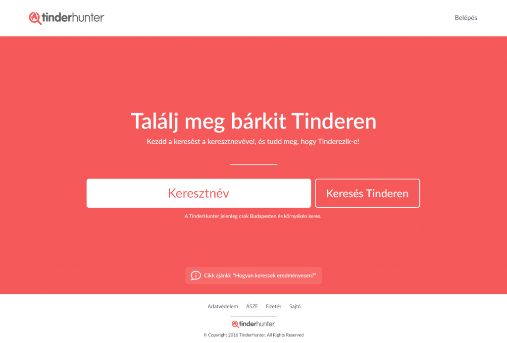 Eddig egyetlen lehetőséged volt: Regisztrálsz Tinderre te is, és húzogatod az embereket amíg meg nem találod a párod, de a több, mint 110.000 budapesti felhasználó között ez egy nagyon sokáig tartana. Ennél sokkal könnyebb megoldást nyújt az új weboldal, a TinderHunter, amivel egyszerűen kereshetsz a Tinder felhasználók között.