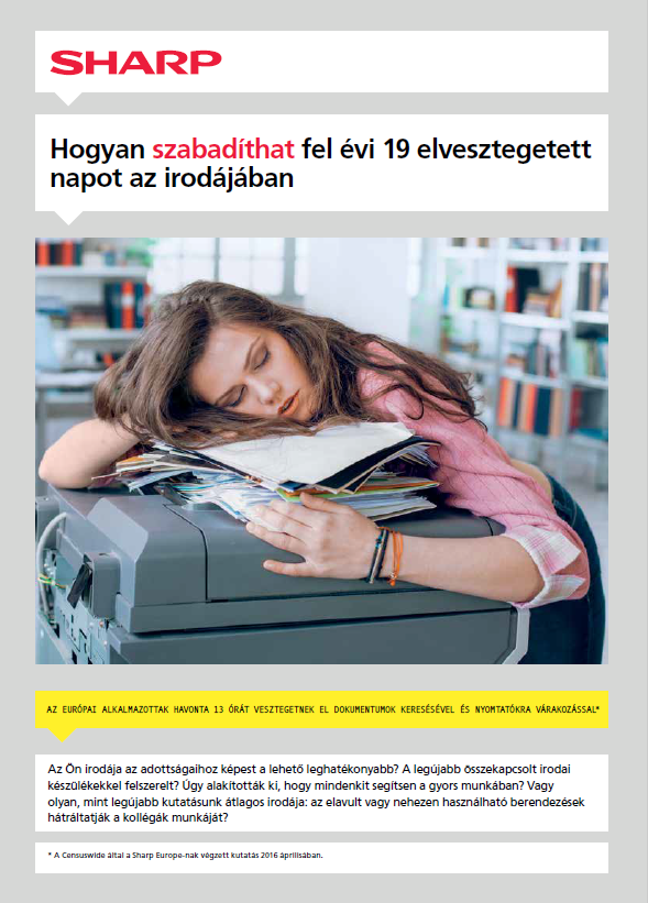 A Sharp 6.000 irodai dolgozót kérdezett meg kilenc európai országban (köztük 500 főt Magyarországon), és azt állapította meg, hogy az átlagos európai munkavállaló évente 19 napot veszteget el a lassú vagy nem hatékony technikai berendezések miatt. Ez közel négy elfecsérelt hétnek felel meg. Az irodai készülékeknek a gyorsabb munkát kellene elősegíteniük, de a valóságban a régi berendezések és az elavult, nehezen kezelhető