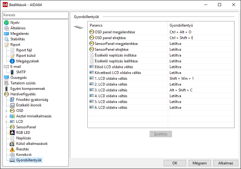 Gyorsbillentyűk az LCD-oldalak közti váltáshoz, az OSD Panel és a SensorPanel elrejtéséhez és megjelenítéséhez, valamint a naplózás indításához és leállításához