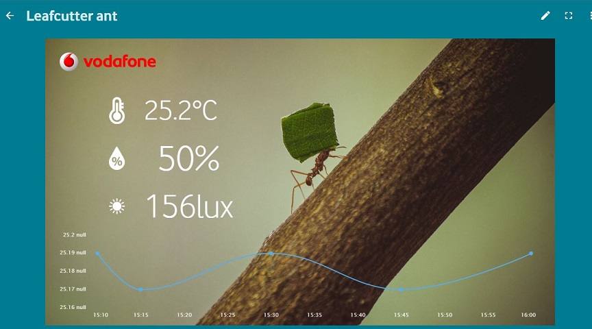 Azonos elven működő IoT rendszert fejlesztett a Vodafone a világ egyik − testméretéhez képest − legerősebb állata, a Dél-Amerikában honos levélvágó hangya terráriumába is, amely a hangyakolónia táplálékát adó, felszín alatti „gombakert” hőmérsékletét figyeli a nap 24 órájában.