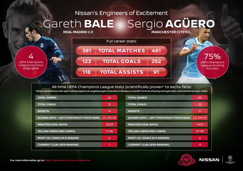 Jean-Pierre Diernaz, a Nissan Europe marketingért felelős alelnöke elmondta: „Nagy örömünkre szolgál, hogy Bale-t és Agüerót a Nissan családjában üdvözölhetjük új nagyköveteinkként és élménymérnökeinkként. Az UEFA Bajnokok Liga partnerség részeként olyan nagykövetekkel akartunk együttműködni, akik osztják közös értékeinket, az innováció és az élmény alapelveit. Miért ők? Mert a Nissanhoz hasonlóan elvetik a konvenciókat, a játék igazi megújítói, és minden pályára lépésükkor lázba hozzák a szurkolókat.”