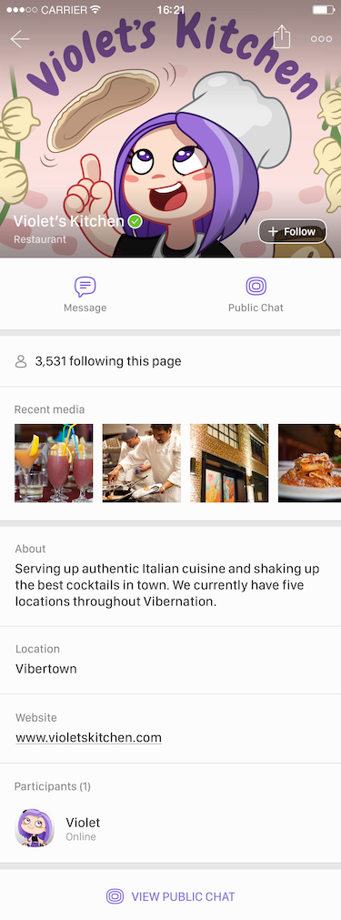Nyilvános Fiók (Public Account) néven indított új szolgáltatást a Viber, amelyen keresztül a cégek és márkák, illetve közéleti szereplők kommunikálhatnak vásárlóikkal, ügyfeleikkel és rajongóikkal. Az új globális kommunikációs platformot üzleti megoldásként a legkisebb és a legnagyobb cégek és márkáknak is igénybe vehetik a célcsoportjaikkal folytatott kommunikációban.