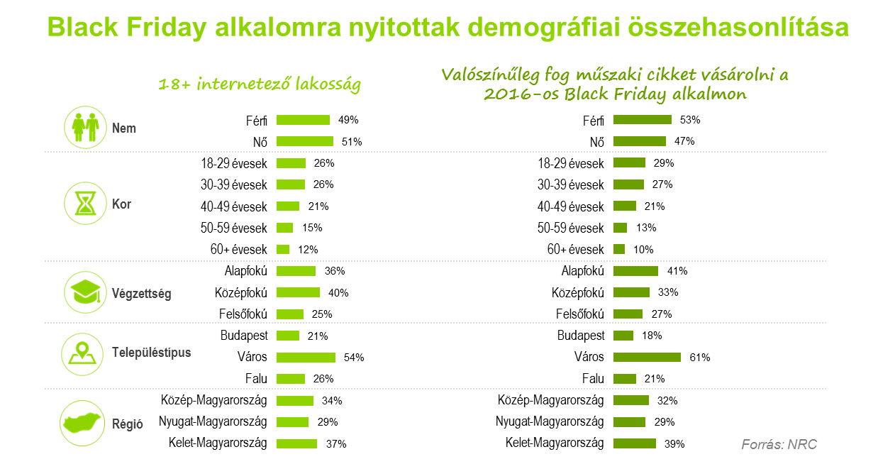 A felnőtt korú internetezők kétharmada hallott már a Black Friday eseményről, legtöbben (14%) a 30-39 évesek körében vásároltak már a korábbi években ezen az akciós napon. Az NRC és a Media Markt a magyar internetező lakosságra nézve reprezentatív kutatásából az is kiderül, hogy a tavalyihoz képest valamelyest növekedett azok száma, akik tervezik műszaki cikk vásárlását Fekete Péntek alkalmával. Idén 27% válaszolta azt, hogy valószínűleg vásárolni fog műszaki cikkeket az akció során, míg 2015-ben ez az arány valamennyi termékkategóriára együttesen kérdezve (nem csak műszaki cikkre) sem érte el ezt az arányt. Az vásárlásra a nők és a férfiak nagyjából hasonló arányban nyitottak, továbbá a 18-39 évesek, és a városban élők terveznek műszaki cikket venni.