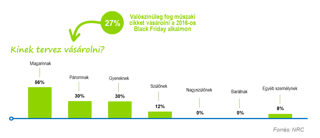 A kutatás azt is mutatja, hogy a vásárlók még kevésbé az ünnepekre készülnek, illetve a vásárlás célja nem csak a karácsonyi ajándék beszerzése. A vásárlást tervezők 56%-a saját magának szeretne egy-egy akciós műszaki cikket beszerezni. Ezen kívül leginkább párjuknak (30%) vagy gyermeknek (30%) terveznek vásárolni.